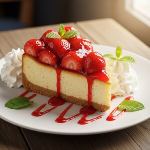 - Decorate and serve: Just before serving, spoon the vibrant strawberry topping over the chilled cheesecake. Arrange whole berries or strawberry halves around the edges for an elegant presentation.